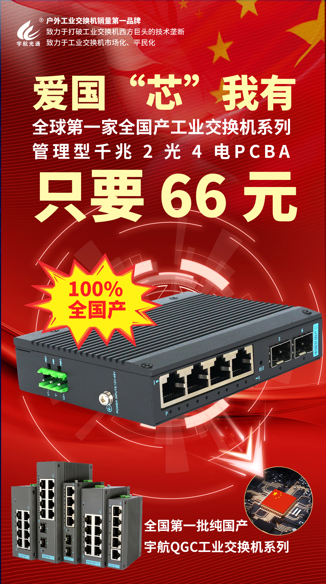 在2023深圳安博會期間,宇航展出了使用國產(chǎn)芯片的全國產(chǎn)管理型千兆2光4電工業(yè)級交換機(jī)。這是全球第一臺100%全國產(chǎn)工業(yè)級管理型交換機(jī),價格僅售66元。這一創(chuàng)新性產(chǎn)品的推出,再次證明了宇航在工業(yè)通信領(lǐng)域的領(lǐng)先地位和卓越的技術(shù)實力。