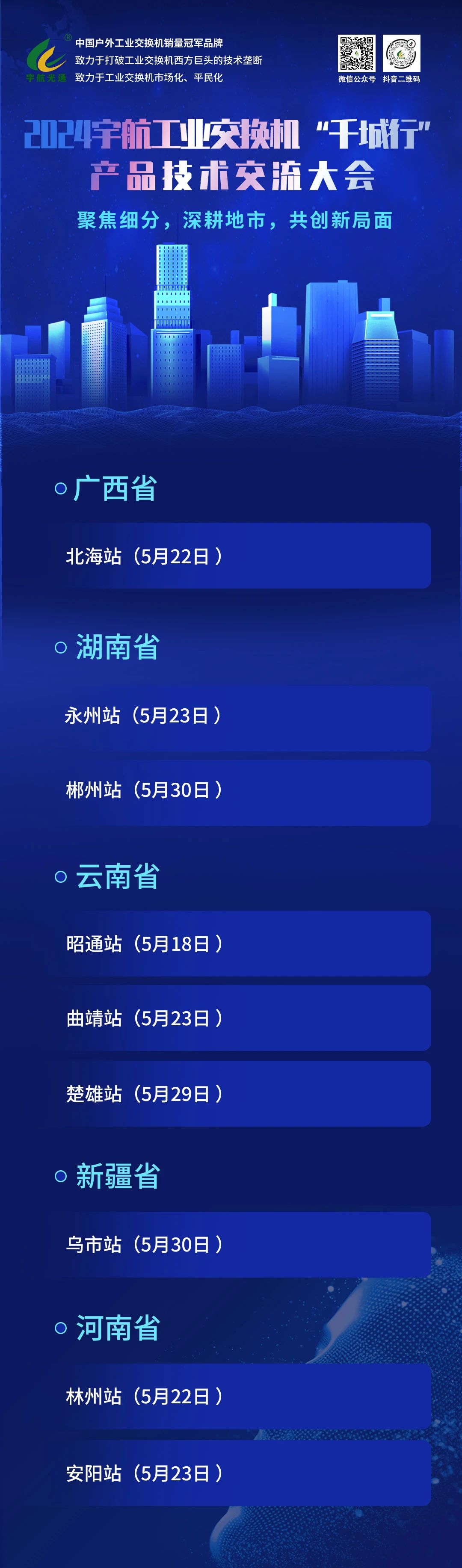 五月中下旬,宇航工業交換機繼續相約與您成都、新疆、山東、北京、湖南(永州、郴州)、廣西北海、云南(昭通、曲靖、楚雄)、河南(林州、安陽)等地市!期待您的蒞臨!